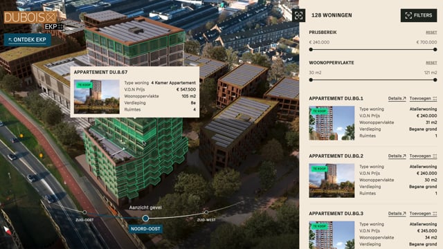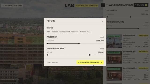 The facade selector allows the visitor to rotate around the building with an interactive animation. Depending on the applied filters and sale status, the apartments or units will turn either green, orange or red. Any special apartments, building parts or units not (yet) for sale can be added in a different colour.